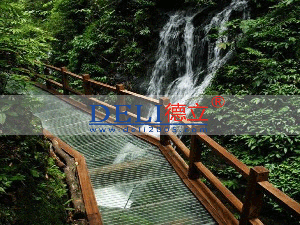 (2)木棧道由表麵平鋪的麵板(或密集排列的木條)和木方架空層兩部分組成。木麵板常用桉木、柚木、冷杉木、鬆木等木材,其厚度要根據下部木架空層的支撐點間距而定,一般為3-5cm厚,板寬一般為10-20cm之間。