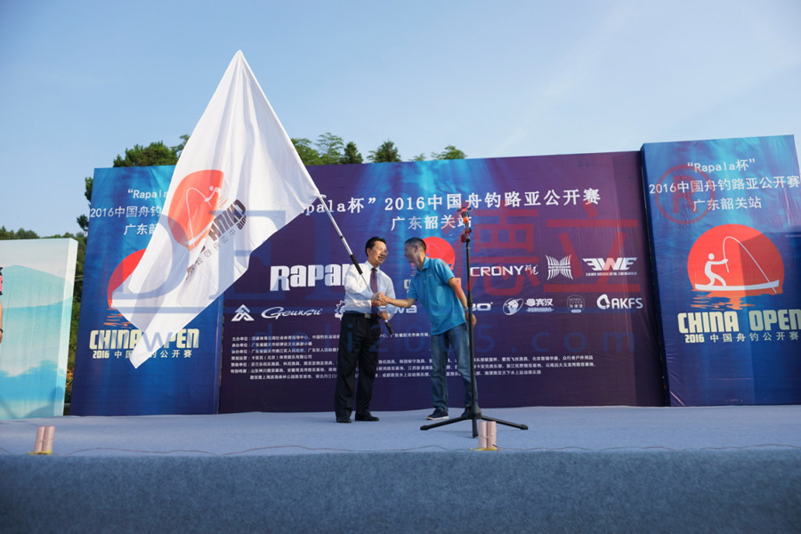 (圖為:中國釣魚運動協會競賽委員會副主任陳智先生將公開賽賽旗授予承辦地經律論文化旅遊小鎮)