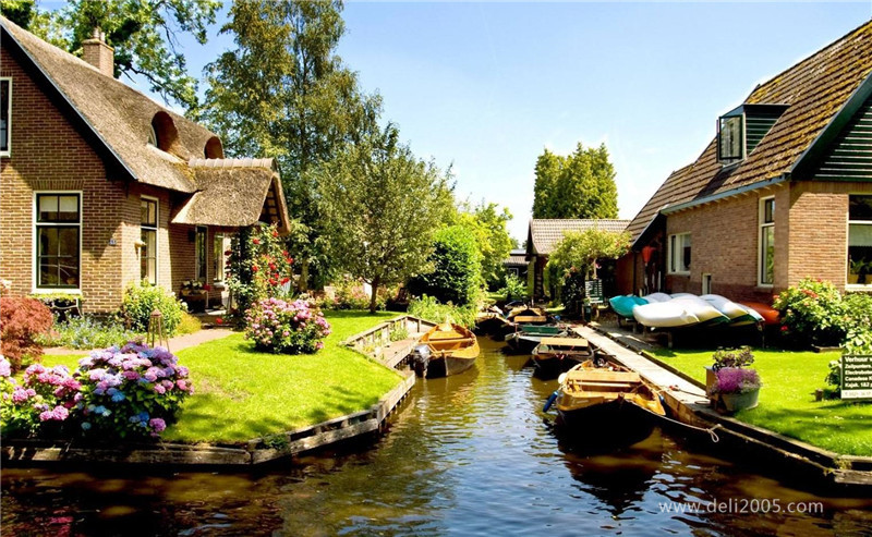 羊角村現在的居民不到3000人,村裏的居民大都住在私人小島上,平時主要的交通工具是平底船、小舟、皮艇或者耳語船(因行駛時悄無聲息而得名)。羊角村有著“荷蘭威尼斯”的稱呼,這裏的交通是離不開船的。這裏的小河穿插,基本上每家每戶都能用河道連接起來,頗有點水上人家的感覺,是歐洲的“江南水鄉”。