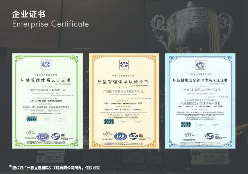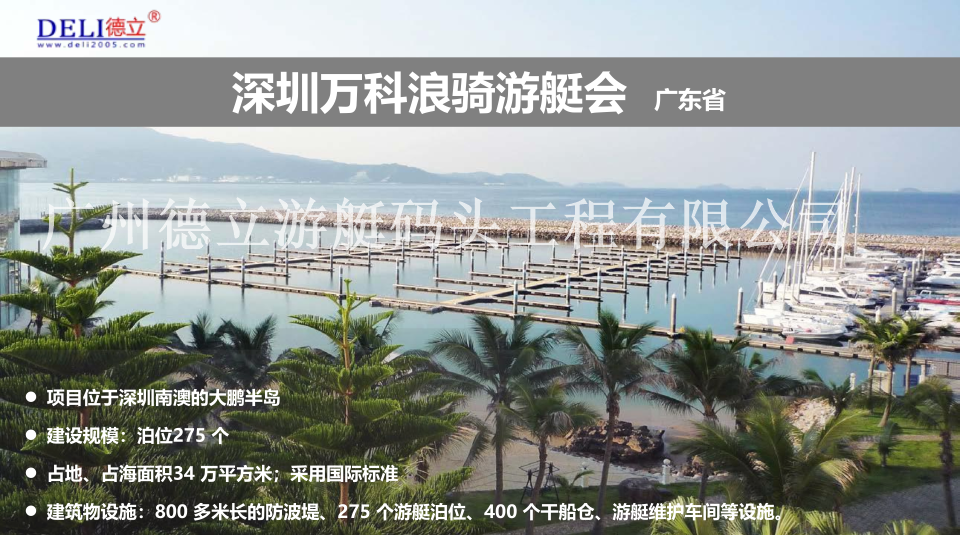 廣州德立遊艇碼頭工程有限公司成立於2005年5月,是以遊艇碼頭項目(遊艇會、帆船港等)為核心,提供谘詢、規劃、設計、建造、投資、運營的綜合服務商;我司是國內首批正式注冊的遊艇碼頭工程公司,主要從事遊艇碼頭、浮橋、水上建築等水上工程。服務內容包括工程項目的谘詢、設計、建造和管理,擁有相關技術知識產權,2013年,德立參與起草《遊艇碼頭浮橋結構製作安裝與檢驗標準》,是國內第一家起草遊艇碼頭技術標準企業。是行業內的資深高新技術企業,見證了遊艇碼頭產業在中國的起步、發展,並參與了國內多個重點項目的開發、建設、運營。