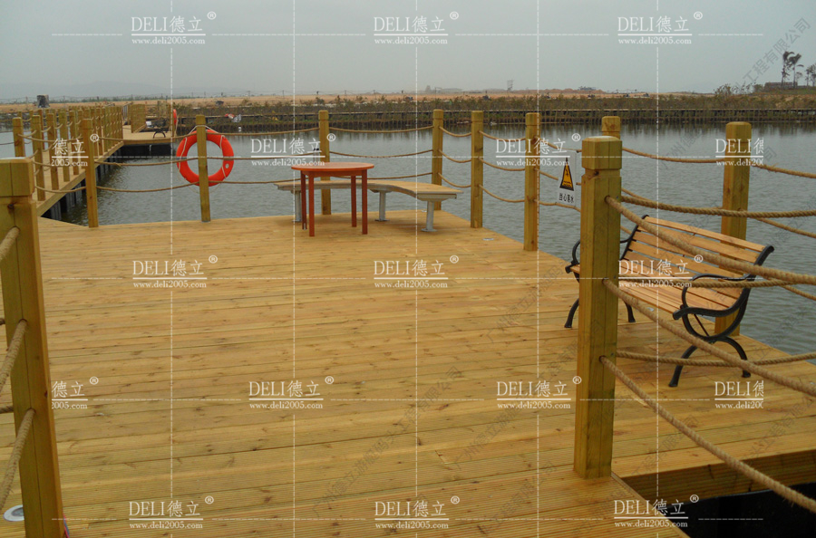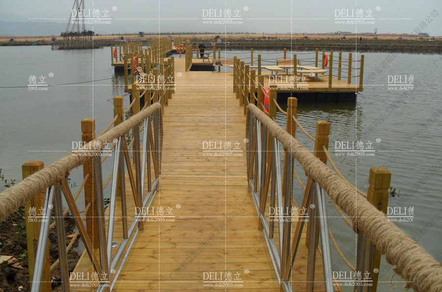 珠海橫琴浮橋長120米,項目從設計到施工,12天內完成,創下行業內新 速度,德立這一壯舉是堅持自主創新、自主知識產權的獨具風格,該橋的設計主要是采用鋼結構受力件、防腐木板及PE塑料浮箱等材料製作而成,設計受載300公斤 / 每平方米,最大落差 2.0 米 ,浮橋兩側設有水上平台可供遊客觀賞及休息,全麵體現了設計的人性化及完美度。