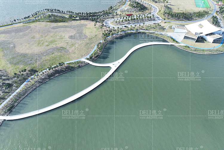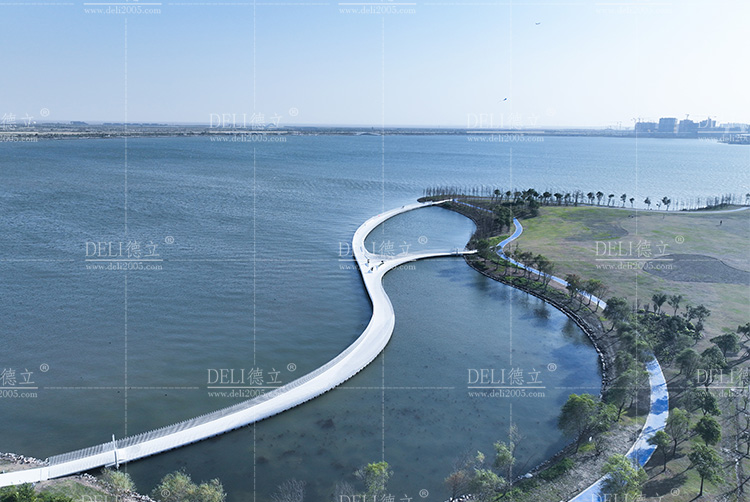 浮橋全長約285m,總麵積約1200㎡,浮橋平麵造型采用了寬度漸變的曲線造型,浮橋沿湖麵線漸變以達到與湖景相融合的效果,浮橋最寬處為5米,最小寬度為3米,利用了曲線的流暢弧度,展現了浮橋柔和感和流動性的形態。