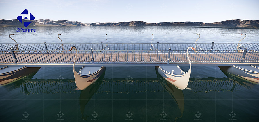 天鵝舟體浮橋全長153米,整體設計以“天鵝”為理念,象征著純潔無瑕、忠貞不渝、不屈不撓、誌存高遠的威尼斯特征。舟體色調采用清爽的天藍與無暇的純白(寓意:純潔高貴),局部點綴浴火的紅色(寓意:經過不斷努力、錘煉和改變,就能變得出類拔萃,蛻變成浴火的鳳凰)。