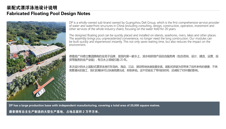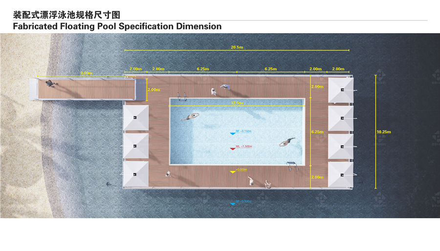德立集團生產的漂浮泳池是一種安全、裝配式、豪(hao)華(hua)的(de)浮(fu)池(chi)。讓(rang)客(ke)人(ren)在(zai)水(shui)上(shang)別(bie)墅(shu)或(huo)遊(you)艇(ting)派(pai)對(dui)上(shang)享(xiang)受(shou)在(zai)海(hai)洋(yang)中(zhong)遊(you)泳(yong)的(de)體(ti)驗(yan)。遊(you)泳(yong)池(chi)用(yong)一(yi)個(ge)緊(jin)密(mi)編(bian)織(zhi)的(de)網(wang)保(bao)護(hu)水(shui)母(mu)和(he)海(hai)洋(yang)生(sheng)物(wu),並(bing)提(ti)供(gong)一(yi)個(ge)封(feng)閉(bi)的(de)區(qu)域(yu),以(yi)防(fang)止(zhi)客(ke)人(ren)在(zai)水(shui)流(liu)中(zhong)漂(piao)出(chu)安(an)全(quan)區(qu)域(yu)。我(wo)們(men)提(ti)供(gong)多(duo)種(zhong)泳(yong)池(chi)配(pei)置(zhi),如(ru)躺(tang)椅(yi),遮(zhe)陽(yang)傘(san)等(deng),以(yi)適(shi)應(ying)您(nin)的(de)水(shui)域(yu)環(huan)境(jing)和(he)旁(pang)邊(bian)的(de)建(jian)築(zhu)設(she)施(shi)。