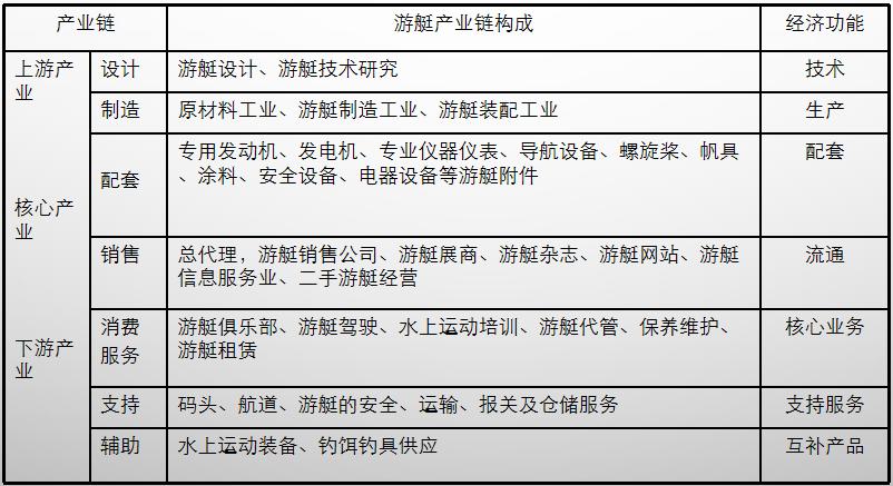 遊艇產業價值鏈是由設計、製造、銷售及消費服務以及休閑旅遊、維護保養和支持輔助等關聯產業共同組成的價值鏈條。遊艇產業鏈上下遊各環節之間存在著資金、信息和物質的流動和交換過程