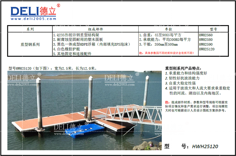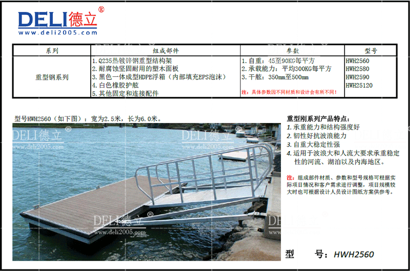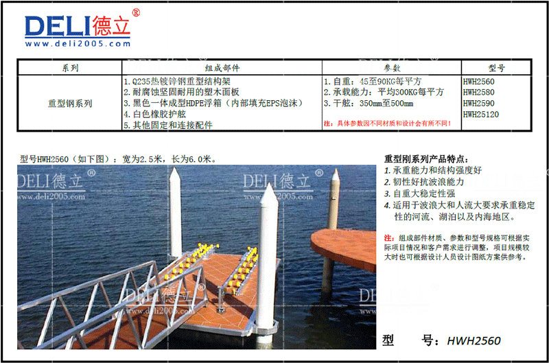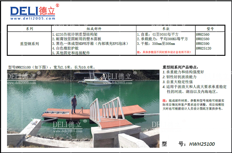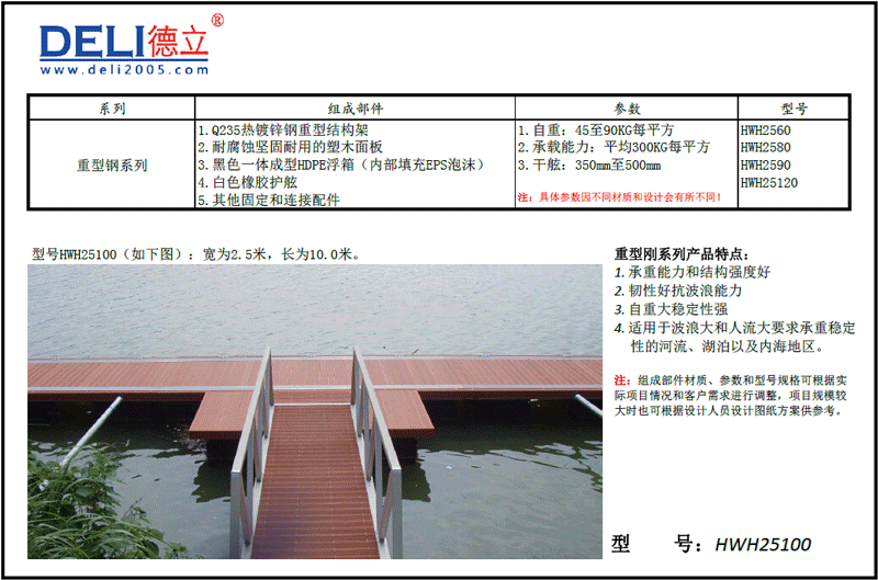 主要組件:浮箱+熱鍍鋅鋼結構+防腐木鋪板(或者塑木、硬木等其他鋪板)