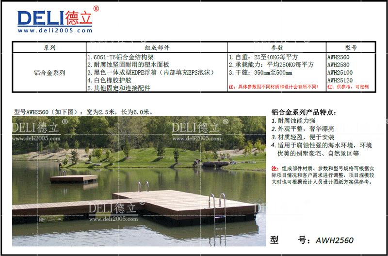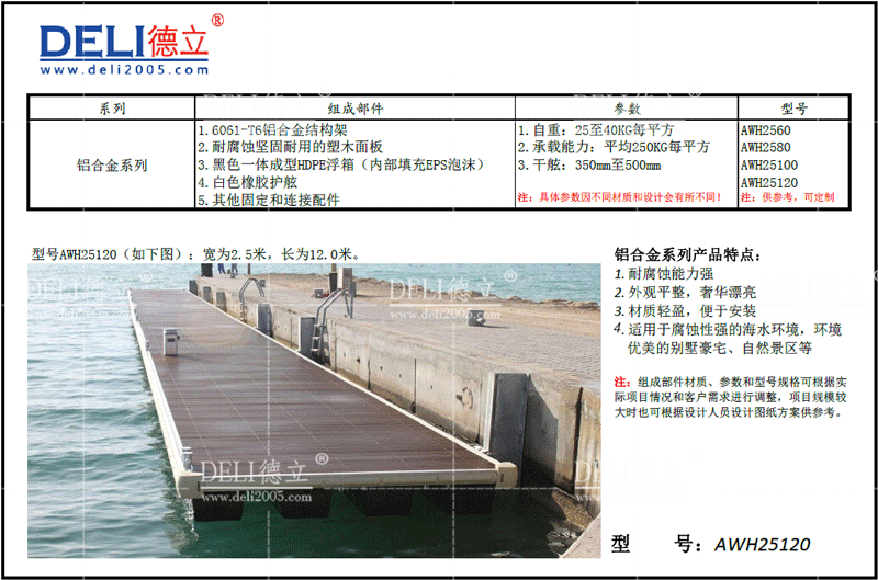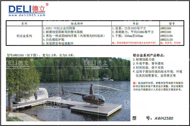 廣(guang)州(zhou)德(de)立(li)遊(you)艇(ting)碼(ma)頭(tou)工(gong)程(cheng)有(you)限(xian)公(gong)司(si)汲(ji)取(qu)國(guo)外(wai)鋁(lv)合(he)金(jin)碼(ma)頭(tou)的(de)成(cheng)功(gong)經(jing)驗(yan),經(jing)過(guo)多(duo)年(nian)技(ji)術(shu)攻(gong)關(guan),終(zhong)於(yu)開(kai)發(fa)出(chu)了(le)新(xin)型(xing)的(de)鋁(lv)合(he)金(jin)遊(you)艇(ting)碼(ma)頭(tou)。德(de)立(li)新(xin)型(xing)鋁(lv)合(he)金(jin)遊(you)艇(ting)碼(ma)頭(tou)采(cai)用(yong)航(hang)海(hai)級(ji)的(de)6061鋁合金,T6熱處理,MIGhanzhiercheng,biaomianjingguokexuedechuli,zengqianglekuangjiadekangyanghuanenglihekangfushinengli,kexuanyongjinkouhuwaifangfusongmu,sumu,boluogezuoweipubancailiao。muqianyichukoushateelabodengguojia。wosidelvhejinmatoujingguoyangeceshi,chanpinzhiliangyijiejinguowaixianjinshuizhun。