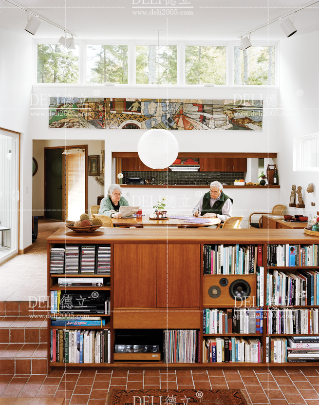 Peter Cohen做了將近50年的建築師之後,他為自己和妻子Sally設計了一個新家,坐落在美國緬因州的埃爾斯沃思。夫妻兩人坐在餐廳,下邊就是客廳,上邊的窗戶是遙控的。