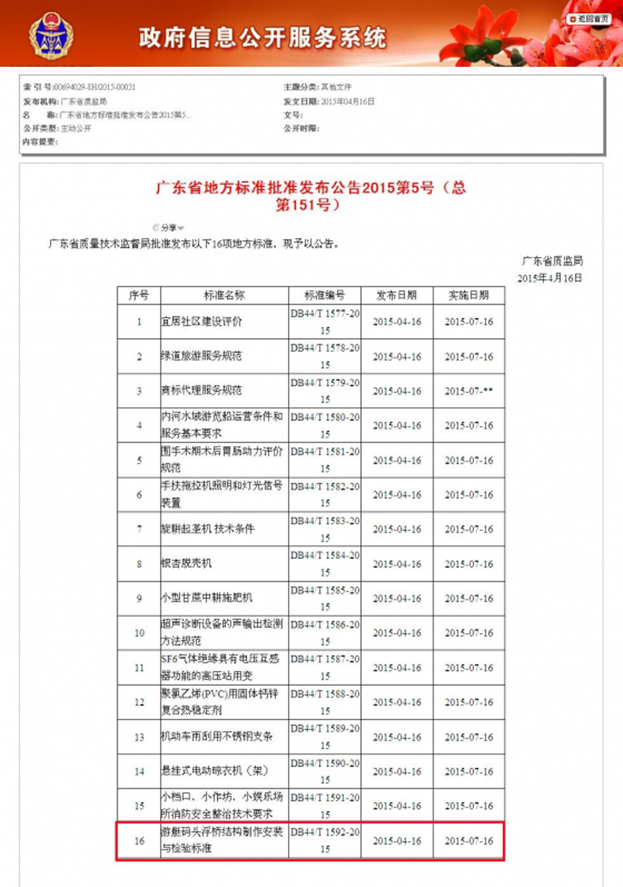 2015年4月16日,廣東省質監局《廣東省地方標準批準發布公告2015第5號》(總第151號)通告,為填補行業空白,規範我省遊艇碼頭(浮橋)行業的生產經營行為,確保產品質量,英德市質量技術監督局聯合英德市德立浮橋工程有限公司、廣州德立遊艇碼頭工程有限公司製定了《遊艇碼頭(浮橋)製作安裝與檢驗標準》(以下簡稱《標準》),編號為DB44/T 1592-2015,予批準發布,自2015年7月16日起施行。