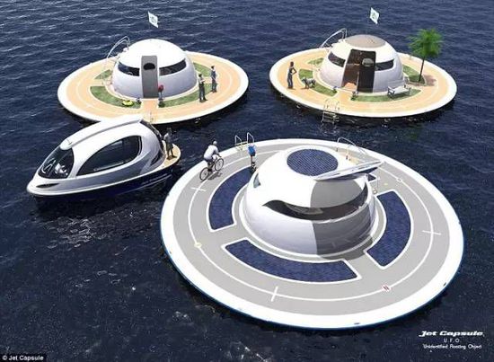 一個來自意大利的團隊最近設計完成這個叫做Unidentified Floating Object(神秘漂浮物)的項目,內容是建造一艘遊艇,具體來說,它擁有兩個半球艙作為乘客房間;四周碟片狀的漂浮板作為曬太陽的甲板,甲板上還有數個小花園;遊艇本身由太陽能、風能或水能供電。