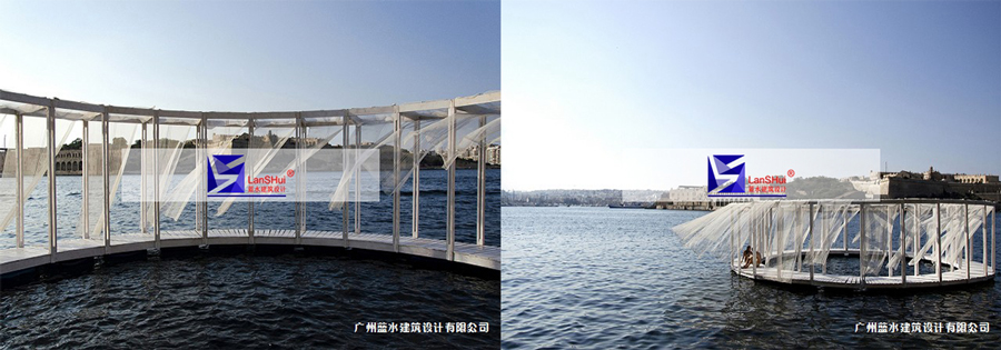 zheshihaishangdeyizuorengongpiaofudao。zhezuoxiaodaokeyishuoyuanlileludidiqu,ruguoxiangdaoshangmianquzuozuozhinengyouguoquhuozhehuachuanguoqu。gaixiaodaodemuzhijiegouwanquanduliyuhaohandehaimian,erzhongjiandekaikongjiurutongshiyigeneibudexiaoyouyongchi。zhenggejiegoujiuxiangshiwuxianxunhuandemenlang,rutongyigehuanxingdexiaosimiao。qishejilinianzaiyu“超越時間的概念”。