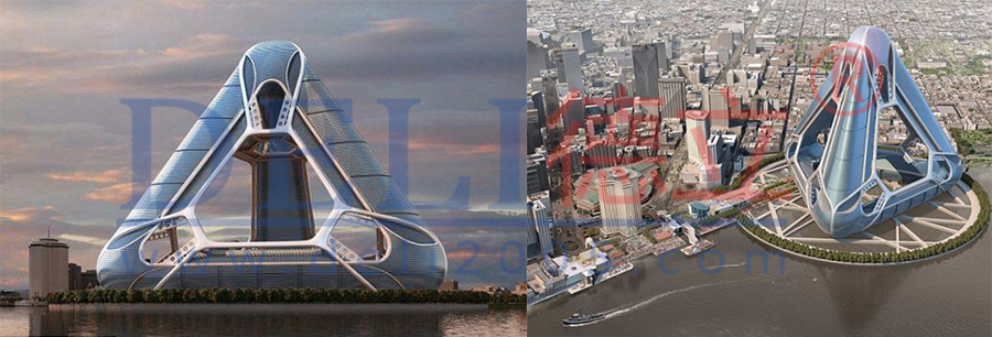 這種外形怪異的三角形建築出自美國建築師凱文•朔普費爾之手,旨在把颶風對建築物的破壞降至最低值,設計靈感來源於如何避免2005年“卡特裏娜”颶風對美國新奧爾良市造成的巨大破壞。