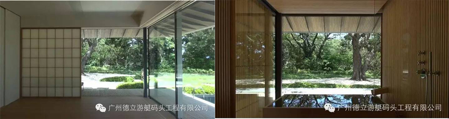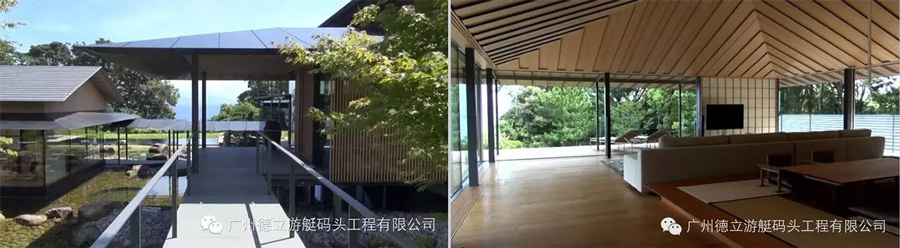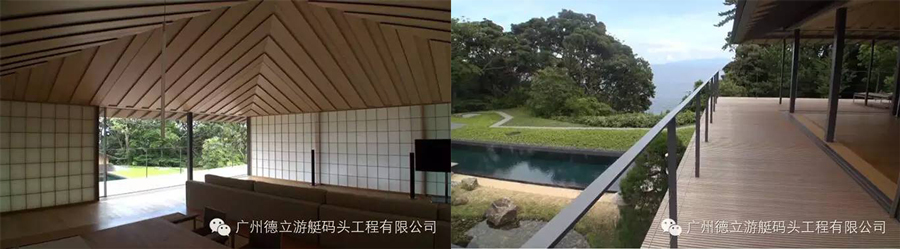 它ta由you一yi係xi列lie坡po屋wu頂ding建jian築zhu組zu成cheng,並bing由you一yi條tiao室shi外wai步bu道dao連lian接jie,使shi建jian築zhu與yu自zi然ran水shui景jing間jian建jian立li友you好hao的de關guan聯lian。纖xian細xi的de金jin屬shu框kuang架jia和he步bu道dao以yi及ji沒mei有you主zhu體ti建jian築zhu的de分fen散san式shi空kong間jian布bu局ju創chuang造zao了le一yi種zhong輕qing盈ying漂piao浮fu的de感gan覺jiao,立li麵mian裝zhuang飾shi有you寬kuan敞chang的de透tou明ming玻bo璃li,反fan射she了le天tian空kong和he周zhou圍wei樹shu木mu,讓rang建jian築zhu在zai水shui麵mian上shang若ruo隱yin若ruo現xian。屋wu頂ding飛fei簷yan底di部bu和he戶hu外wai平ping台tai裝zhuang飾shi了le一yi層ceng輕qing薄bo的de木mu板ban,木mu平ping台tai被bei單dan獨du的de榻ta榻ta米mi和he室shi隔ge斷duan,內nei部bu設she有you紙zhi拉la門men和he花hua紋wen天tian花hua板ban。