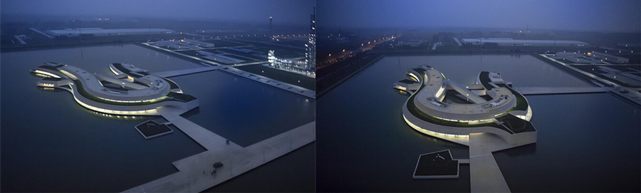 仿(fang)佛(fo)喚(huan)起(qi)一(yi)個(ge)栩(xu)栩(xu)如(ru)生(sheng)的(de)龍(long),優(you)雅(ya)地(di)懸(xuan)在(zai)水(shui)中(zhong),輪(lun)廓(kuo)輕(qing)輕(qing)起(qi)伏(fu)。它(ta)的(de)幾(ji)何(he)形(xing)體(ti)和(he)廠(chang)房(fang)的(de)功(gong)能(neng)性(xing)矩(ju)形(xing)量(liang)體(ti)相(xiang)互(hu)對(dui)應(ying)。白(bai)色(se)的(de)弧(hu)線(xian)扭(niu)轉(zhuan),交(jiao)替(ti)開(kai)闔(he),在(zai)水(shui)麵(mian)環(huan)繞(rao)著(zhe)特(te)殊(shu)氣(qi)氛(fen),形(xing)成(cheng)詩(shi)意(yi)的(de)景(jing)觀(guan)。不(bu)斷(duan)變(bian)化(hua)的(de)色(se)彩(cai)和(he)水(shui)中(zhong)的(de)倒(dao)影(ying)不(bu)斷(duan)相(xiang)互(hu)作(zuo)用(yong),或(huo)深(shen)淺(qian)不(bu)同(tong)的(de)光(guang)線(xian)和(he)陰(yin)影(ying),使(shi)得(de)建(jian)築(zhu)千(qian)變(bian)萬(wan)化(hua)。無(wu)論(lun)從(cong)地(di)麵(mian)、水麵或空中視角,優雅的建築寧靜的表達一個實體輕輕觸碰到一個虛體時所產生的美。