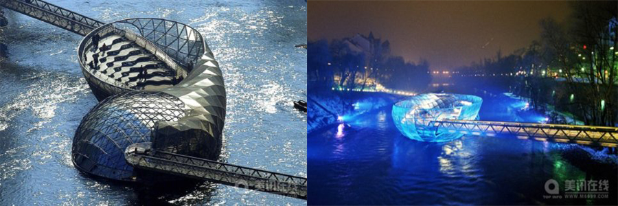 由紐約當代藝術建築師Vito Acconci所設計,是一座位於河中央的水上劇場,它是格拉茲成為2003歐洲文化之都其中一個項目。格拉茲位於阿爾卑斯山南,是奧地利的第二大城市,建於15世紀,部分地區至今仍保有中古世紀風貌,並於1999年成為聯合國教科文組織指定之世界文化遺產城市。格拉茲的城市風貌兼具了古典的優雅和現代的時尚,也因此Acconci將這座既夢幻又實際的前衛建築置入其中,不但不顯得突兀,還頗為貼切。