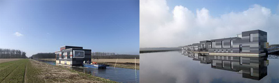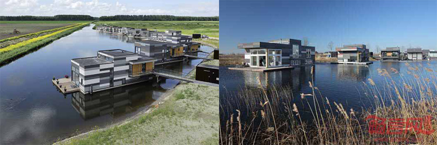 項目名為“漂浮在Lelystad”,包含八座水上漂浮住宅。業主童年都在水麵上度過,他們一直夢想擁有漂浮住宅。這些業主組成了一個集體,委托Attika建築事務所設計八座各不相同、和諧皮排的住宅。所在城市Lelystad海拔低於海平麵4.8米,項目場地位於河溝邊。設計師根據業主同的要求和期盼,賦予住宅不同的尺寸、顏色和形狀。