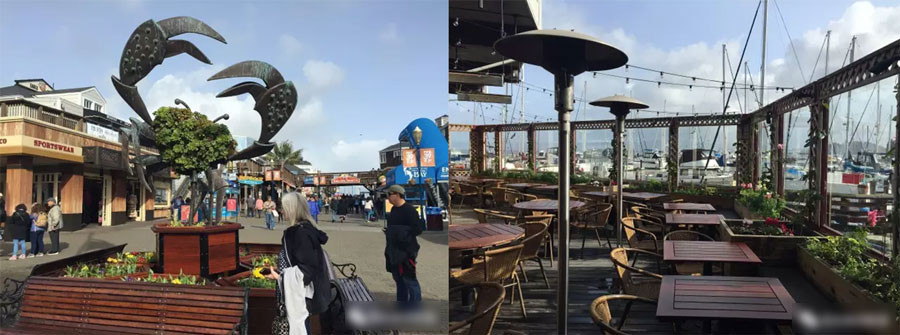 漁(yu)人(ren)碼(ma)頭(tou)過(guo)去(qu)曾(zeng)是(shi)意(yi)大(da)利(li)漁(yu)夫(fu)的(de)停(ting)泊(bo)碼(ma)頭(tou),如(ru)今(jin)已(yi)是(shi)舊(jiu)金(jin)山(shan)最(zui)熱(re)門(men)的(de)去(qu)處(chu),終(zhong)年(nian)熱(re)鬧(nao)非(fei)凡(fan)。傑(jie)弗(fu)遜(xun)街(jie)和(he)泰(tai)勒(le)街(jie)交(jiao)彙(hui)處(chu)的(de)巨(ju)蟹(xie)標(biao)記(ji)是(shi)漁(yu)人(ren)碼(ma)頭(tou)的(de)象(xiang)征(zheng)。各(ge)國(guo)觀(guan)光(guang)客(ke)來(lai)到(dao)舊(jiu)金(jin)山(shan)都(dou)要(yao)來(lai)這(zhe)裏(li)享(xiang)受(shou)一(yi)頓(dun)新(xin)鮮(xian)美(mei)味(wei)的(de)海(hai)產(chan)宴(yan)。碼(ma)頭(tou)附(fu)近(jin)還(hai)有(you)海(hai)洋(yang)公(gong)園(yuan)博(bo)物(wu)館(guan)等(deng)。漁(yu)人(ren)碼(ma)頭(tou)的(de)標(biao)誌(zhi)是(shi)一(yi)個(ge)畫(hua)有(you)大(da)螃(pang)蟹(xie)的(de)圓(yuan)形(xing)廣(guang)告(gao)牌(pai),找(zhao)到(dao)了(le)“大螃蟹”,就到了漁人碼頭,也就到了舊金山品嚐海鮮的首選地點。39號漁人碼頭是濱水休閑商業中心,也是著名的旅遊景區,這裏不僅設有各式海鮮餐廳、特色商業街,還有遊艇碼頭,是各地漁人碼頭的代表作,是濱水休閑度假景區的樣板。