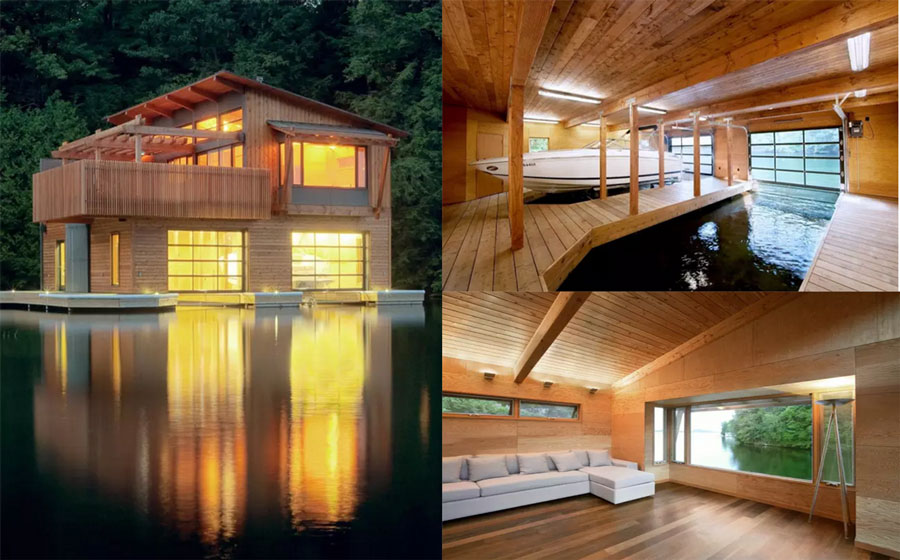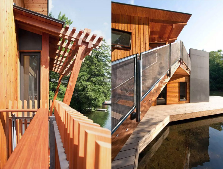 船(chuan)屋(wu)的(de)材(cai)料(liao)大(da)部(bu)分(fen)采(cai)用(yong)天(tian)然(ran)木(mu)材(cai),與(yu)屋(wu)後(hou)的(de)森(sen)林(lin)形(xing)成(cheng)對(dui)應(ying)關(guan)係(xi),讓(rang)船(chuan)屋(wu)和(he)自(zi)然(ran)更(geng)加(jia)自(zi)然(ran)貼(tie)合(he)。建(jian)築(zhu)外(wai)牆(qiang)用(yong)西(xi)部(bu)紅(hong)雪(xue)鬆(song)木(mu)與(yu)水(shui)泥(ni)板(ban)覆(fu)蓋(gai),水(shui)泥(ni)板(ban)和(he)外(wai)部(bu)露(lu)台(tai)的(de)拉(la)斯(si)冷(leng)杉(shan)木(mu)讓(rang)二(er)樓(lou)的(de)露(lu)台(tai)隱(yin)私(si)感(gan)更(geng)強(qiang),也(ye)加(jia)大(da)了(le)安(an)全(quan)性(xing)能(neng)。露(lu)台(tai)欄(lan)杆(gan)結(jie)構(gou)十(shi)分(fen)穩(wen)定(ding),防(fang)護(hu)鋼(gang)的(de)框(kuang)架(jia)結(jie)構(gou)固(gu)定(ding)了(le)拉(la)斯(si)冷(leng)杉(shan)木(mu),且(qie)在(zai)內(nei)部(bu)加(jia)一(yi)道(dao)護(hu)欄(lan)形(xing)成(cheng)雙(shuang)重(zhong)防(fang)護(hu),讓(rang)人(ren)在(zai)水(shui)邊(bian)也(ye)可(ke)以(yi)愉(yu)快(kuai)安(an)心(xin)玩(wan)耍(shua)。從(cong)森(sen)林(lin)沿(yan)岸(an)連(lian)接(jie)到(dao)二(er)樓(lou)的(de)露(lu)台(tai)的(de)外(wai)部(bu)樓(lou)梯(ti)采(cai)用(yong)防(fang)護(hu)鋼(gang)框(kuang)架(jia),用(yong)絲(si)網(wang)填(tian)充(chong),讓(rang)船(chuan)屋(wu)在(zai)保(bao)證(zheng)了(le)安(an)全(quan)的(de)同(tong)時(shi)增(zeng)添(tian)一(yi)分(fen)現(xian)代(dai)時(shi)尚(shang)感(gan)。樓(lou)梯(ti)連(lian)接(jie)了(le)陸(lu)地(di)森(sen)林(lin)和(he)房(fang)屋(wu)的(de)關(guan)係(xi),使(shi)房(fang)屋(wu)不(bu)那(na)麼(me)漂(piao)泊(bo)無(wu)依(yi),並(bing)引(yin)向(xiang)人(ren)流(liu)進(jin)入(ru)第(di)二(er)層(ceng)的(de)屋(wu)頂(ding)露(lu)台(tai)。
