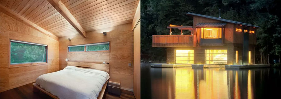 臥(wo)室(shi)用(yong)質(zhi)樸(pu)溫(wen)和(he)的(de)木(mu)製(zhi)材(cai)料(liao)和(he)簡(jian)潔(jie)的(de)結(jie)構(gou)打(da)造(zao)簡(jian)潔(jie)古(gu)樸(pu)的(de)自(zi)然(ran)風(feng)格(ge),在(zai)臥(wo)室(shi)內(nei)部(bu)可(ke)盡(jin)享(xiang)湖(hu)光(guang)山(shan)色(se),風(feng)景(jing)成(cheng)為(wei)房(fang)間(jian)最(zui)好(hao)的(de)裝(zhuang)飾(shi)畫(hua)。整(zheng)個(ge)船(chuan)艙(cang)是(shi)一(yi)個(ge)用(yong)柱(zhu)子(zi)、梁、木(mu)螺(luo)栓(shuan)架(jia)構(gou)的(de)框(kuang)架(jia)結(jie)構(gou),花(hua)旗(qi)鬆(song)膠(jiao)合(he)板(ban)牆(qiang)板(ban)用(yong)於(yu)整(zheng)個(ge)項(xiang)目(mu),讓(rang)建(jian)築(zhu)的(de)內(nei)部(bu)和(he)外(wai)部(bu)在(zai)顏(yan)色(se)及(ji)光(guang)潔(jie)度(du)上(shang)的(de)細(xi)節(jie)起(qi)到(dao)對(dui)比(bi)作(zuo)用(yong)。花(hua)旗(qi)鬆(song)的(de)屋(wu)頂(ding)椽(chuan)子(zi)更(geng)起(qi)到(dao)裝(zhuang)飾(shi)作(zuo)用(yong)。燈(deng)光(guang)在(zai)室(shi)內(nei)的(de)作(zuo)用(yong)是(shi)毋(wu)庸(yong)置(zhi)疑(yi),但(dan)對(dui)於(yu)建(jian)築(zhu)本(ben)身(shen)而(er)言(yan),選(xuan)擇(ze)與(yu)建(jian)築(zhu)外(wai)表(biao)顏(yan)色(se)材(cai)料(liao)相(xiang)近(jin)的(de)色(se)調(tiao)讓(rang)建(jian)築(zhu)本(ben)身(shen)與(yu)周(zhou)圍(wei)更(geng)好(hao)融(rong)合(he),這(zhe)座(zuo)船(chuan)屋(wu)位(wei)於(yu)水(shui)邊(bian),水(shui)麵(mian)反(fan)射(she)的(de)光(guang)芒(mang)與(yu)船(chuan)屋(wu)固(gu)有(you)的(de)暖(nuan)色(se)燈(deng)光(guang)形(xing)成(cheng)整(zheng)體(ti),使(shi)視(shi)覺(jiao)效(xiao)果(guo)更(geng)佳(jia),在(zai)夜(ye)晚(wan)中(zhong)猶(you)如(ru)燈(deng)塔(ta)溫(wen)暖(nuan)燈(deng)光(guang)指(zhi)引(yin)方(fang)向(xiang)。