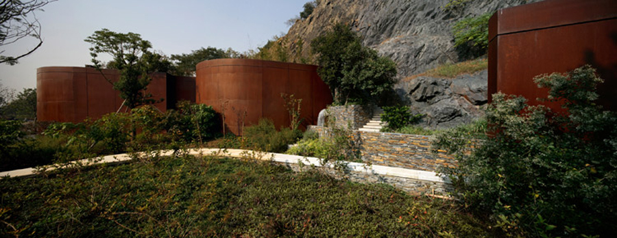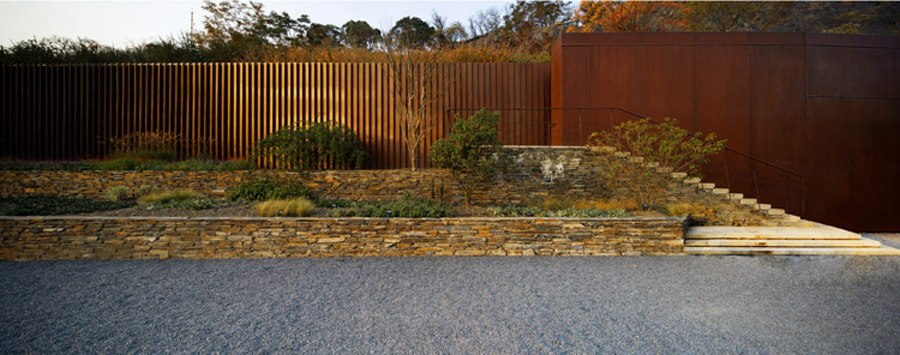 設計師選擇了同時用“加減法”應對采石礦坑特殊形態的生態修複設計原則:采取“加法”celvetongguodixingzhongsuhezengjiazhibeilaigoujianxindeshengwuqunluo。zhenduiluoludeshantiyabi,shejishimeiyoucaiquchangguidebaoguofangfa,ershizunzhongyabijingguandezhenshixing。zaichuyuanquankaolvdeyouxiaobirangqiantixia,shejishicaiqulebujiaganyude“減法”策略,使崖壁在雨水、陽(yang)光(guang)等(deng)自(zi)然(ran)條(tiao)件(jian)下(xia)進(jin)行(xing)自(zi)我(wo)修(xiu)複(fu)。對(dui)於(yu)存(cun)留(liu)的(de)台(tai)地(di)邊(bian)緣(yuan)擋(dang)土(tu)牆(qiang),設(she)計(ji)師(shi)用(yong)鏽(xiu)鋼(gang)板(ban)這(zhe)種(zhong)帶(dai)有(you)工(gong)業(ye)印(yin)記(ji)的(de)材(cai)料(liao),對(dui)其(qi)進(jin)行(xing)包(bao)裹(guo),形(xing)成(cheng)有(you)節(jie)奏(zou)變(bian)化(hua)和(he)光(guang)影(ying)韻(yun)律(lv)的(de)景(jing)觀(guan)界(jie)麵(mian)。