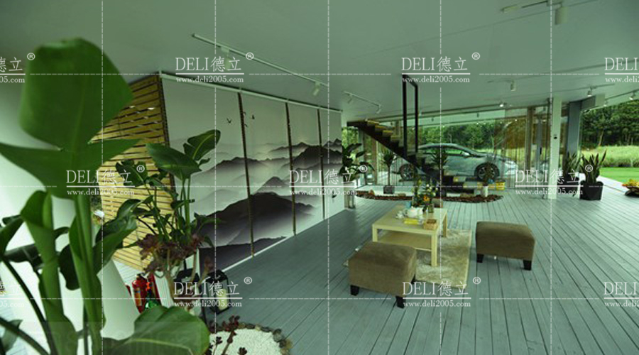 屋子分為上下兩層,一層是小花園休閑區,可以用做會客區和一個可升降的車庫。 圖為一樓的小花園休閑區。