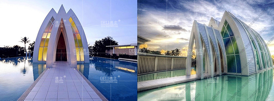 另一(yi)座(zuo)白(bai)色(se)的(de)教(jiao)堂(tang),初(chu)看(kan)有(you)些(xie)像(xiang)停(ting)泊(bo)在(zai)此(ci)處(chu)的(de)船(chuan)隻(zhi)。在(zai)水(shui)之(zhi)上(shang),宗(zong)教(jiao)神(shen)聖(sheng)的(de)氛(fen)圍(wei)感(gan)更(geng)強(qiang)烈(lie)了(le)起(qi)來(lai)。整(zheng)個(ge)空(kong)間(jian)是(shi)完(wan)全(quan)開(kai)放(fang)的(de)設(she)計(ji),細(xi)直(zhi)的(de)線(xian)條(tiao)立(li)柱(zhu)很(hen)有(you)設(she)計(ji)感(gan)。