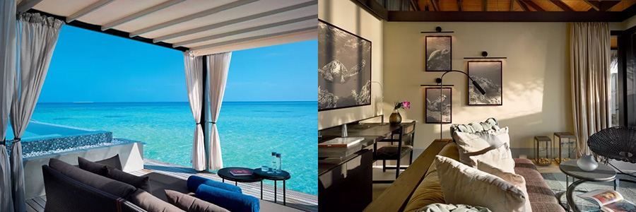 設計風格如夢似幻,泳池和陽光甲板都設有通往海洋的階梯,躺在房間就可以盡攬日落勝景!空間寬闊而舒適的起居室配備有酒吧區,更有私人酒櫃。