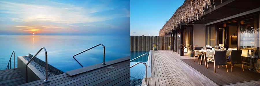 日出/日落水上泳池別墅是Velaa超(chao)級(ji)受(shou)寵(chong)的(de)兩(liang)款(kuan)房(fang)型(xing),別(bie)墅(shu)沿(yan)著(zhe)一(yi)處(chu)長(chang)長(chang)的(de)碼(ma)頭(tou)依(yi)次(ci)排(pai)開(kai),呈(cheng)美(mei)麗(li)的(de)月(yue)牙(ya)狀(zhuang),可(ke)覽(lan)盡(jin)印(yin)度(du)洋(yang)和(he)私(si)人(ren)泳(yong)池(chi)的(de)旖(yi)旎(ni)風(feng)光(guang)。臥(wo)室(shi)和(he)浴(yu)室(shi)連(lian)著(zhe)露(lu)台(tai)、泳池和陽光甲板,更有直接通往誘人海中的階梯。