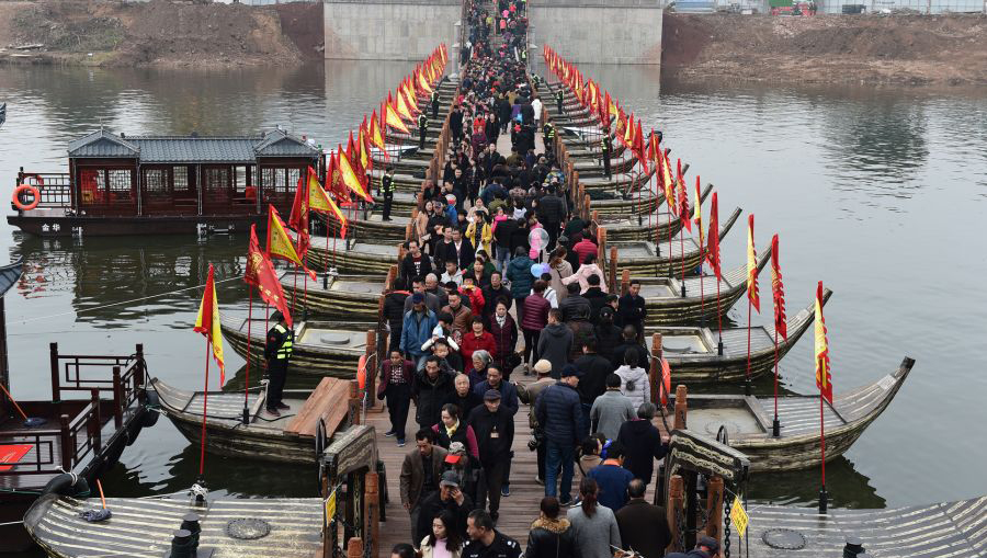 義烏市佛堂鎮,義烏江上首座由眾多民間人士籌資重建的大橋——“萬善浮橋”11月28日開始恢複重建後的試通行,這裏成了眾多遊客遊覽的熱點之一,紛紛有序排起了長隊一一上橋,體驗並爭睹芳容。重建後的浮橋,橋長130米,寬4.5米,由20艘木船連接而成。一頭倚著挽瀾亭,一頭連接著江北的古民居苑,這既是遊客從江北通往古鎮的主入口,是古鎮“一江兩岸三橋”規劃的核心,也是連接江南、江北的一道亮麗風景。