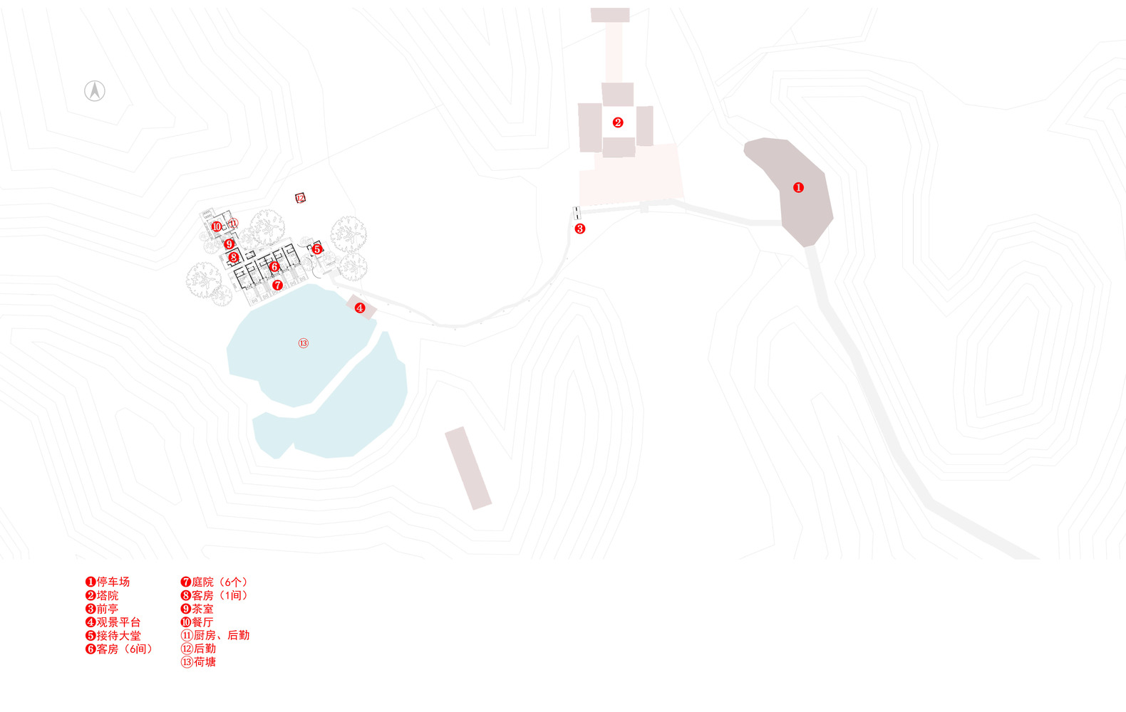 通過接待室、客房、餐(can)廳(ting)三(san)種(zhong)形(xing)態(tai),建(jian)築(zhu)的(de)整(zheng)體(ti)組(zu)合(he)成(cheng)其(qi)功(gong)能(neng)屬(shu)性(xing)。進(jin)入(ru)酒(jiu)店(dian)的(de)路(lu)線(xian)被(bei)現(xian)場(chang)條(tiao)件(jian)所(suo)限(xian)定(ding),因(yin)此(ci)我(wo)們(men)挖(wa)掘(jue)出(chu)一(yi)個(ge)可(ke)以(yi)做(zuo)具(ju)敘(xu)事(shi)性(xing)入(ru)住(zhu)體(ti)驗(yan)的(de)機(ji)會(hui),從(cong)停(ting)車(che)場(chang)、石階、樹林、茶園、石板路、水塘這一路所引發的好奇心,在最終接觸空間時會得到滿足。
