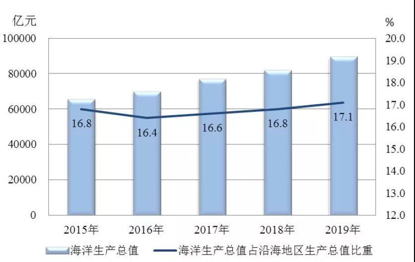 2019年,北部海洋經濟圈海洋生產總值26360億元,比上年名義增長8.1%,占全國海洋生產總值的比重為29.5%;東部海洋經濟圈海洋生產總值26570億元,比上年名義增長8.6%,占全國海洋生產總值的比重為29.7%;南部海洋經濟圈海洋生產總值36486億元,比上年名義增長10.4%,占全國海洋生產總值的比重為40.8%。